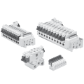 Modflex系列阀是气控先导叠加阀。功能有4/2、3/2与双向3/2。S系列、T系列和V系列有接线配置。V系列是集线式:20针和25针Dsub,支持Devicenet、Profibus DP、 CANopen、Interbus-S和Asi协议。